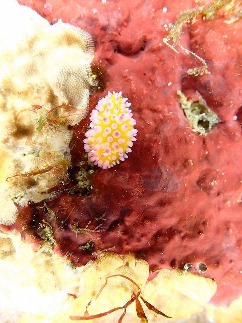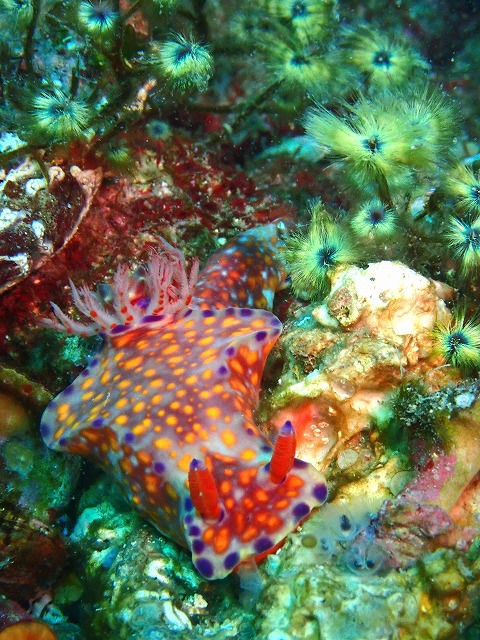 クジャクケヤリをバックに、美しいニシキウミウシ