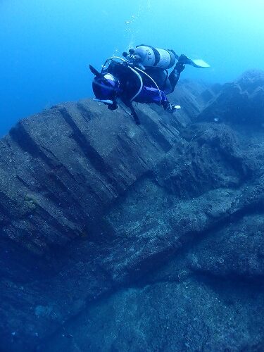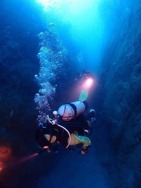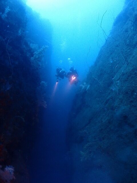 水深40mまで落ちる岩の壁の間を