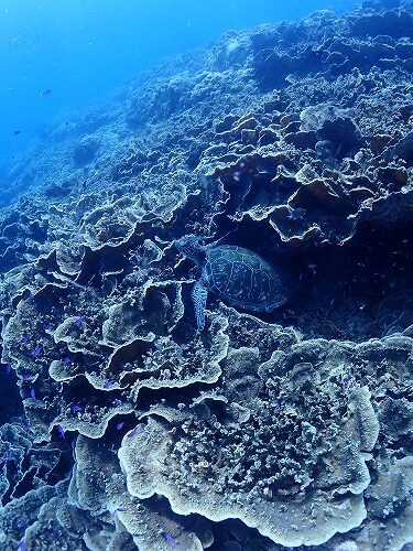 サンゴの隙間を寝床にしているアオウミガメ