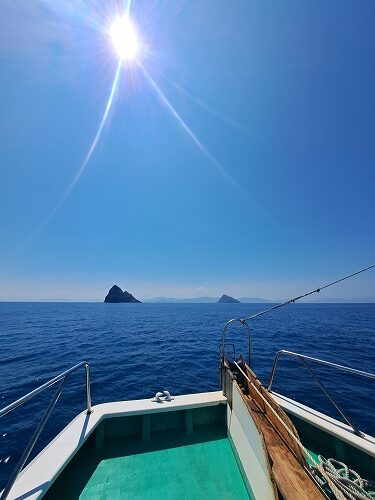 穏やかな島のそばに船を泊めて